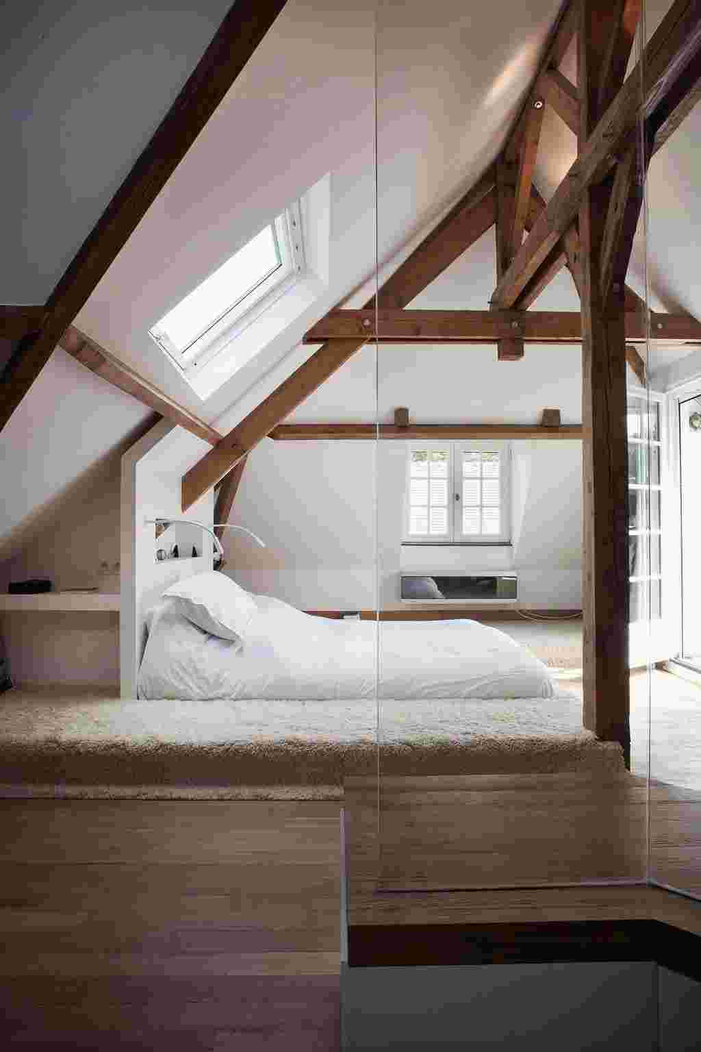 Две стены в спальне выполнены из раздвижных стеклянных перегородок