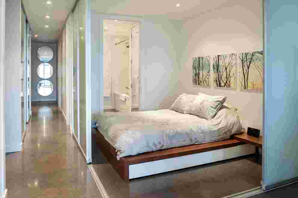 Стильный пример стеклянной перегородки в спальне