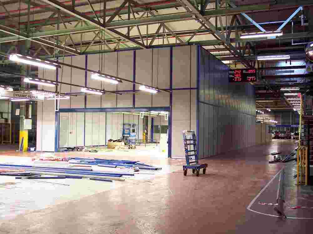 - Приступают к работе. Соблюдая технологию, устанавливают современные перегородки в заводском помещении.
