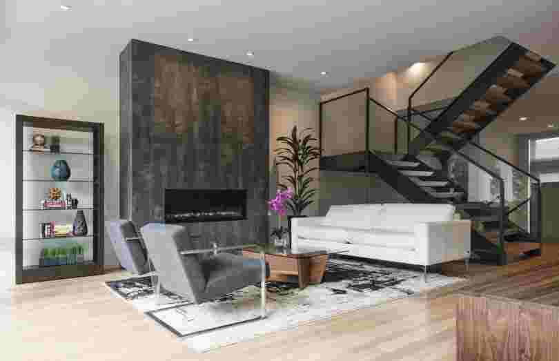 Современные каминные вставки часто имеют минималистичную форму. В дизайне интерьера они хорошо смотрятся в простой оболочке, без декоративных деталей, например, из гладких каменных плит или в оштукатуренной и окрашенной раме.