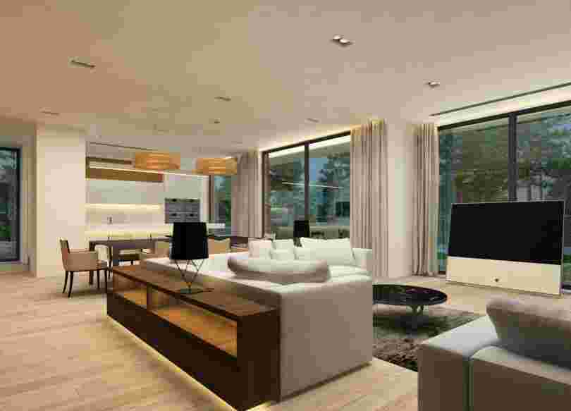 В идеале загородный коттедж в стиле хай-тек должен быть возведен из бетона, стекла, отличаться прямыми формами и с минимальным количеством декора в любом виде на ровных стенах.