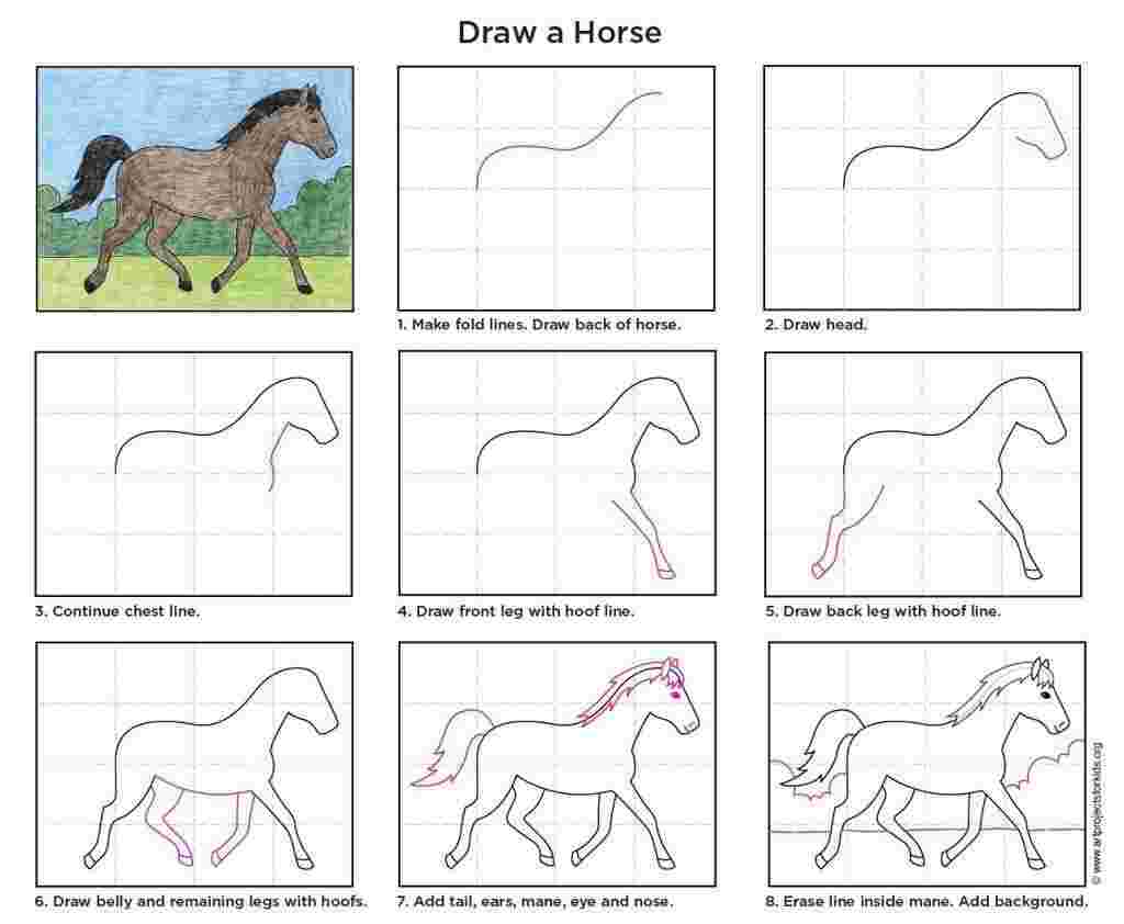 Вы хотите нарисовать лошадь поэтапно, вникнуть во все тонкости изображения этого животного? Постарайтесь запомнить алгоритм, внимательно посмотрите на схемы. Когда вы будете воспроизводить все заданные схемы на вашем листочке бумаги, у вас довольно быстро получится эффектная лошадка.